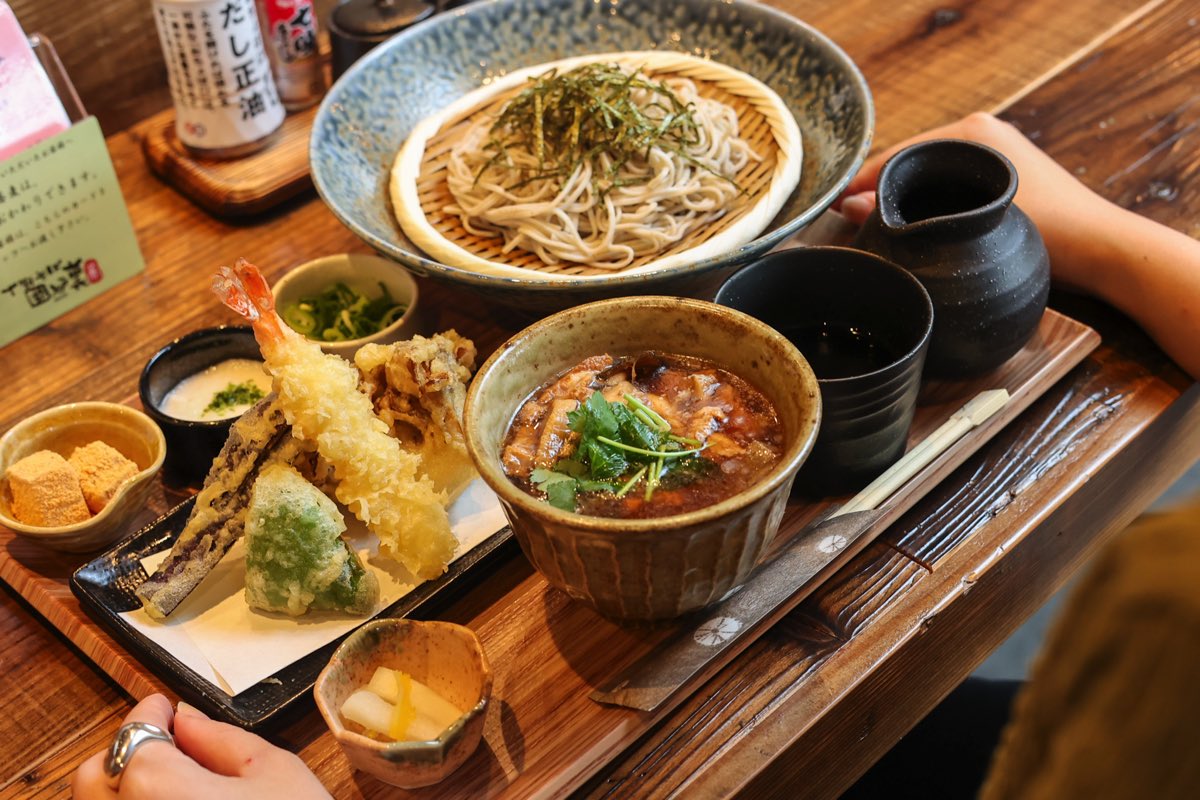 様々なメニューの中でも1番人気は「囲炉裏特製そば御膳」!お蕎麦につけ汁や薬味、4種類の天ぷらなどが贅沢に味わえるとのことで、こちらを食べてみることに。メインのつけ汁は、囲炉裏オリジナルの肉つけ汁と茸つけ汁から選べ、今回は肉付け汁をチョイス♪