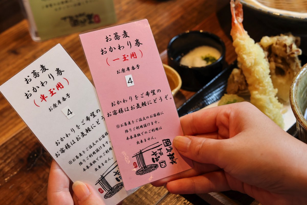 テーブルには “お蕎麦おかわり券”が置いてあり、半玉か一玉かを選んでスタッフに渡すと持ってきてくれる仕組み。私は迷わず一玉~。つけ汁や薬味がたくさんあるので、飽きずに食べられるのも魅力。