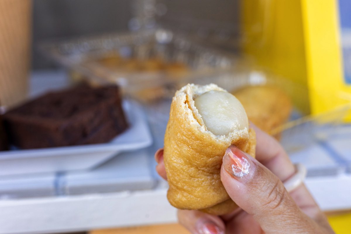 なんと、このお豆腐団子をご飯の代わりに3つ入れた「いなり寿司」も、かなりの変化球~。甘すぎずしょっぱすぎず、品のいい味わいのおいなりさんで、じゅわっと出汁が口の中に溢れると、ふっくらもちっと豆腐団子が顔を覗かせる。