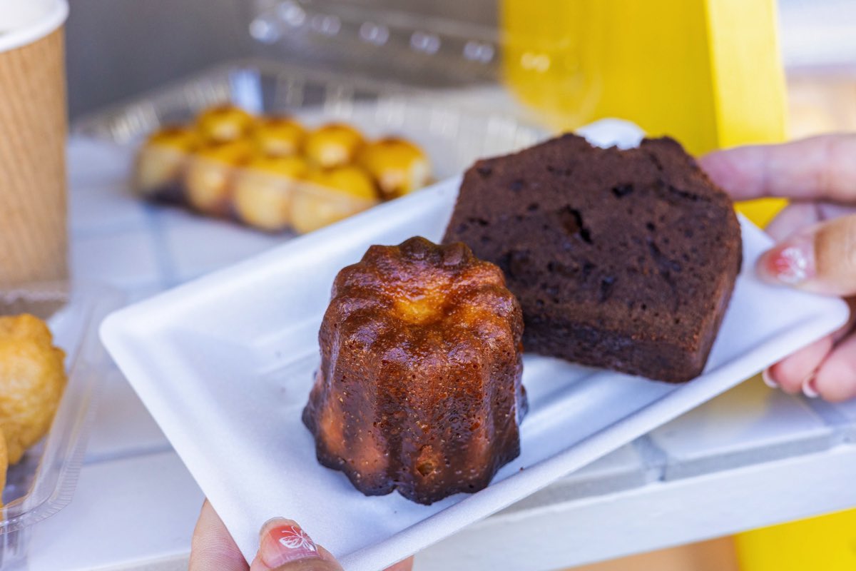 カヌレやパウンドケーキは米粉100%。まわりはカリッと、中はとろ~り半生タイプのカヌレはほろ苦く食感も絶妙で、米粉とは思えない本格的な仕上がりだ。しっかりバターときび砂糖を使った濃厚なチョコパウンドは、チョコ好きにおすすめしたい逸品。