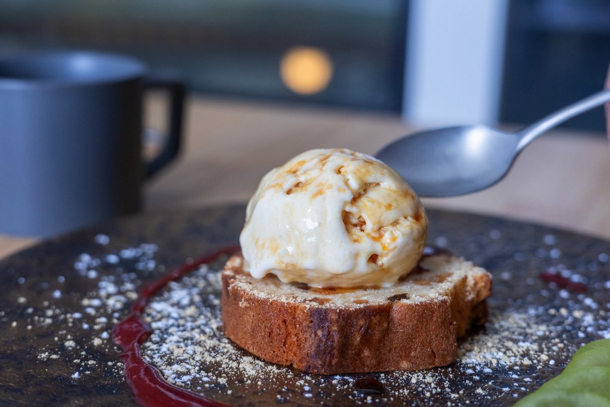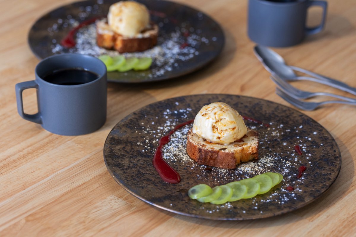 スイーツはその日によってラインナップが変わるが、取材日にはドライフルーツのパウンドケーキが!生クリームではなく酒粕ジェラートをトッピングし、ドリンクセットのコーヒーと食後のご褒美スイーツタイムを満喫してみた。