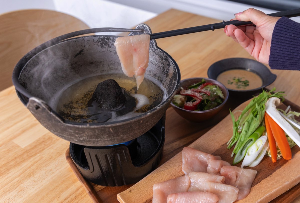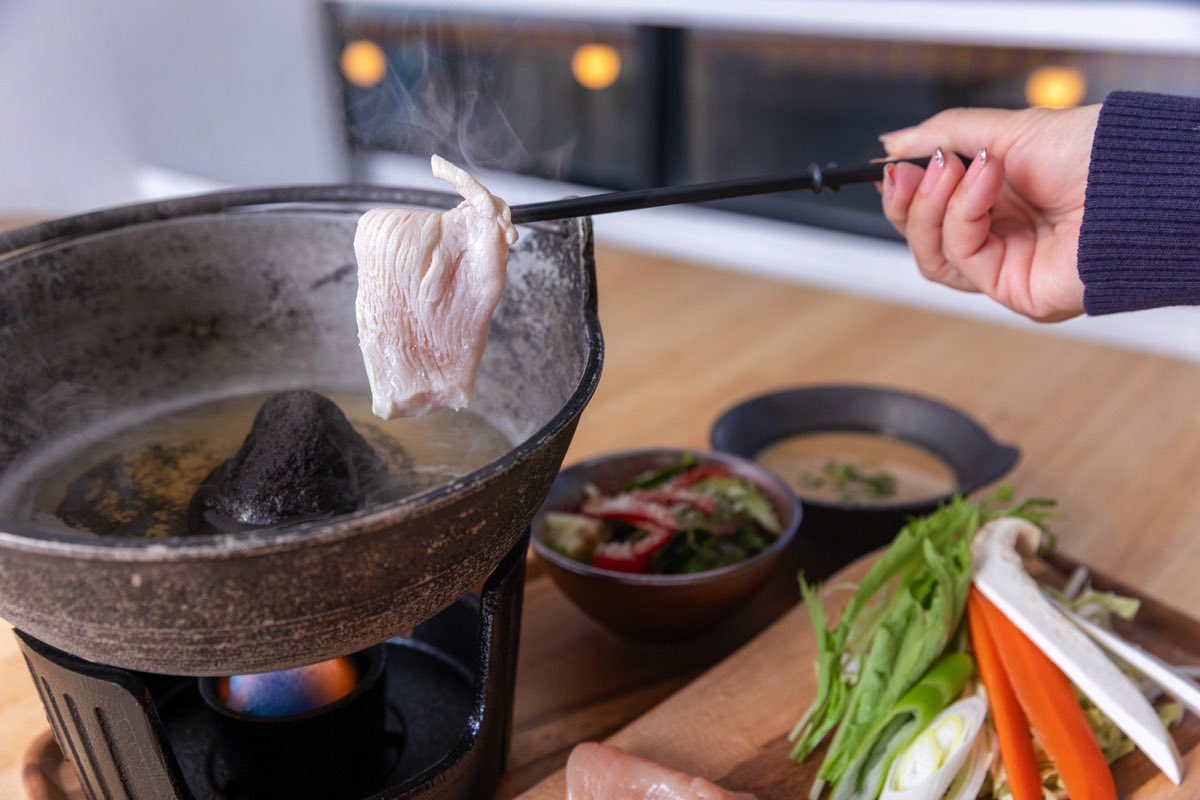 せっかくなので、「焼き溶岩石の爆弾しゃぶしゃぶ」とやらも体感!そう、これは食のパフォーマンス付きで、「体感」できるメニューなのだ。250度のオーブンで焼いた富士山の溶岩石入りのアツアツ鉄鍋に出汁を投入!ジュワ~ッと湯気が立ち上り、文字通り「爆弾しゃぶしゃぶ」タイムのはじまりはじまり~。