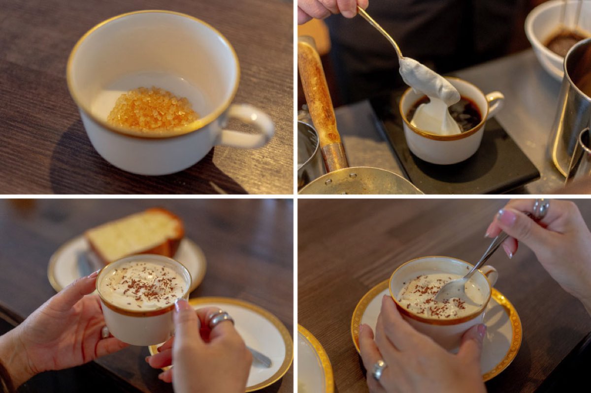 ざらめを沈ませ、香り高くほどよい苦みが感じられるように濃い目に抽出したコーヒーを注ぐ。ふわりとゆるく泡立てたクリームをたっぷりと。