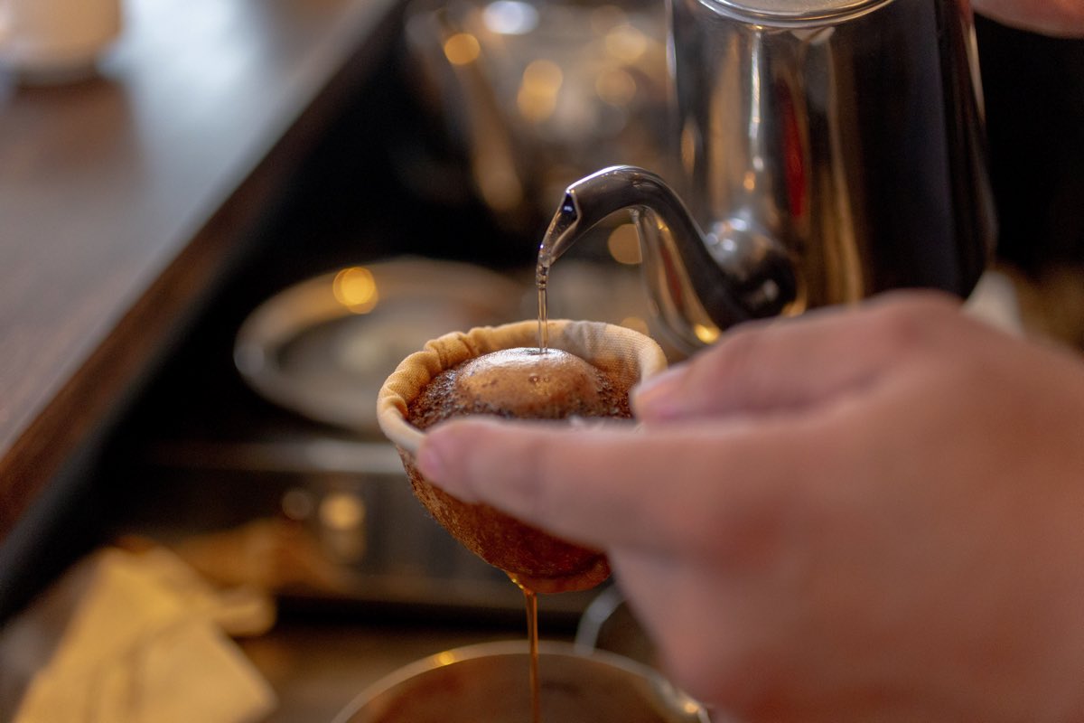 カウンター席に座って抽出風景の一部始終を眺められるという、なんとも贅沢なひと時を満喫できるのも嬉しい。お湯を注ぐたびにコーヒー豆がふっくらとドーム状に膨らみ、ネルフィルターの起毛の間を滑り落ち、黒い液体となって静かに落ちていく。