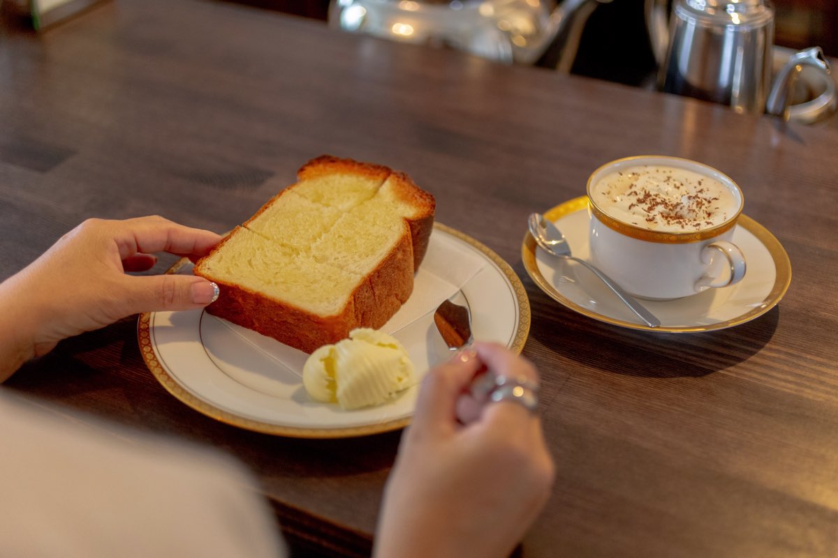コーヒーと共に味わいたいのが、トーストメニュー!マスターお手製の山型食パンを贅沢に厚切りして、シンプルにバタートーストに。バターがジュワっとしみて、パンの美味しさがより際立つ。