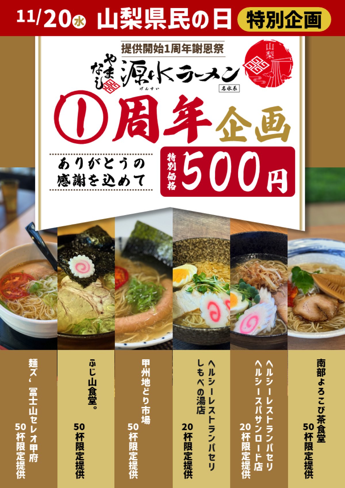 「環富士山名物グルメグランプリ2024」でグランプリに輝いたご当地グルメ「やまなし源水ラーメン」が提供開始1周年を記念し、2024年11月20日(水)の山梨県民の日にナント、ワンコインの500円で食べられちゃう!!
