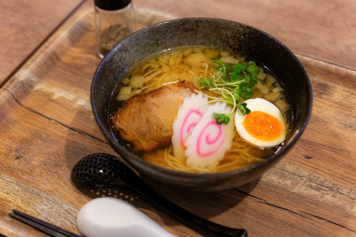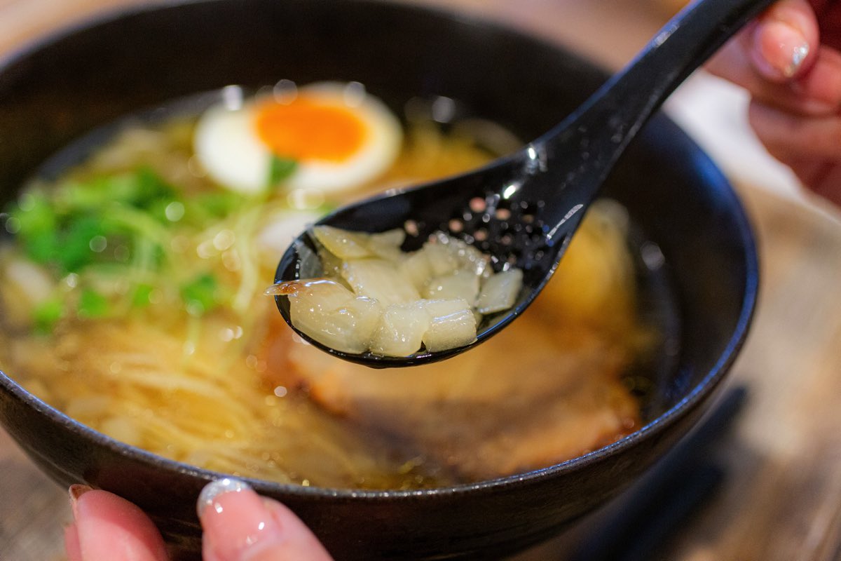 オリジナルトッピングとして山梨県産の玉ねぎの甘みを強調するため、一度揚げてから加え、しゃっきり食感も◎!自家製チャーシューはやわらかながら肉感もしっかり残した低温調理で、甘めに仕上げた。卵はポリフェノールたっぷり、ワインの酒粕を飼料にしたワインたまごでコクと旨味を。