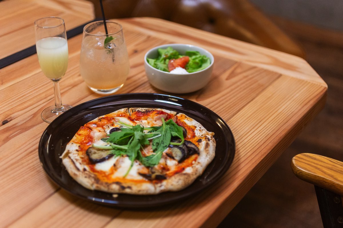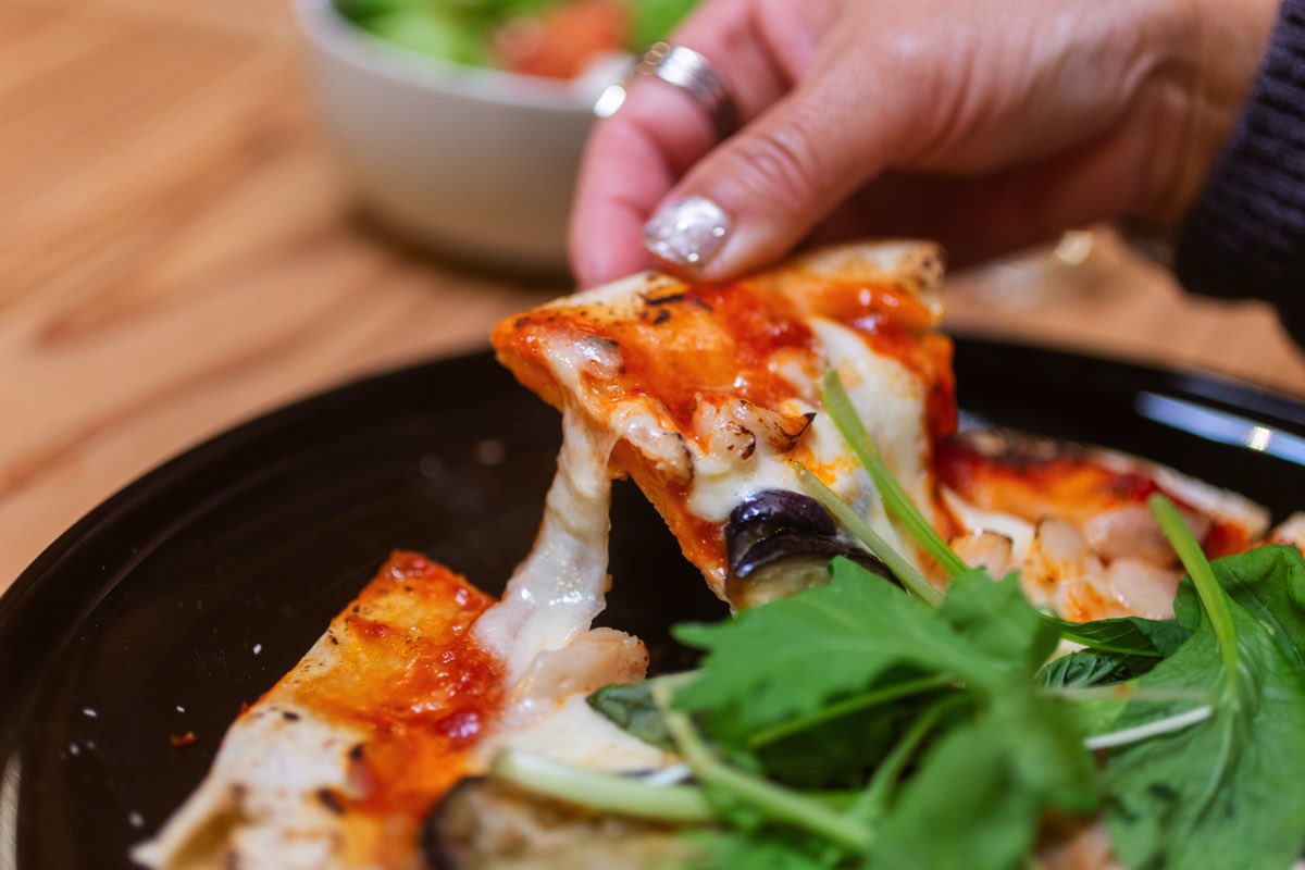 南アルプス市「ベーカリー ルーブル」の生地に、自家製モッツァレラとナスやスパイス香るトマトソースをトッピングした、ちょっぴり豪華なマルゲリータ。