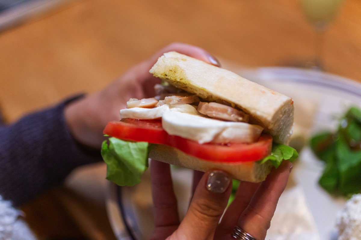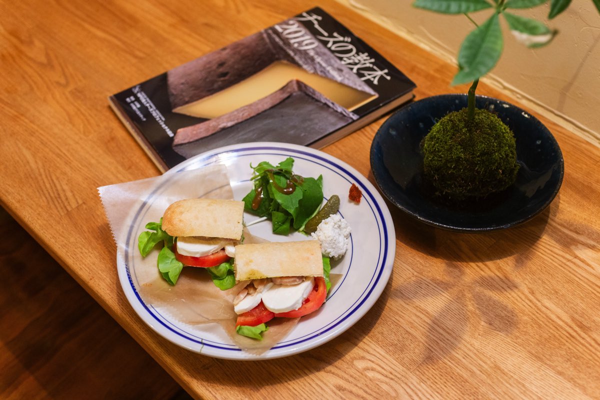 モッツァレラの旨味をもっとダイレクトに味わいたいなら、チャバタサンドイッチがおすすめ。チーズの美味しさを引き立てるよう、麹の力でしっとりやわらかな塩麴鶏ハムを一緒にサンド。