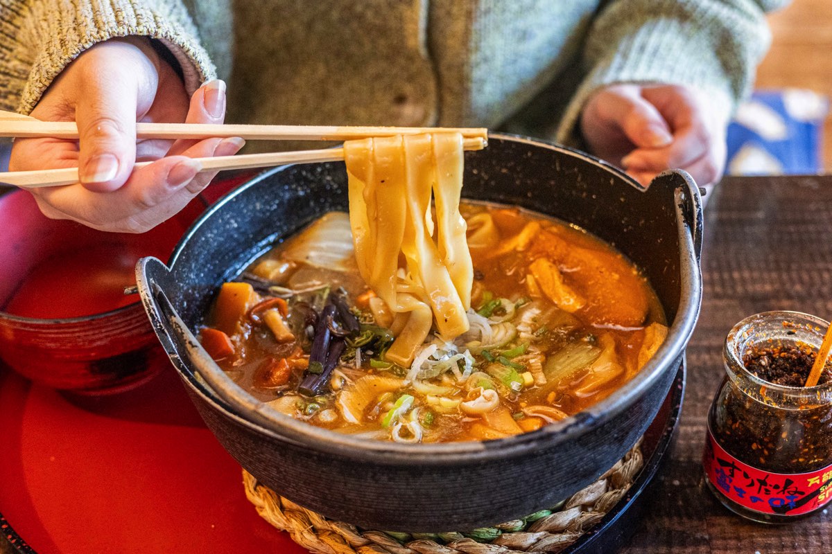 中でも、約4~5種類の野菜やきのこをじっくり煮込んだ「野菜ほうとう」は具材の出汁がしっかりとしみて、味わい深い味噌やもちもちの麺との相性抜群。
