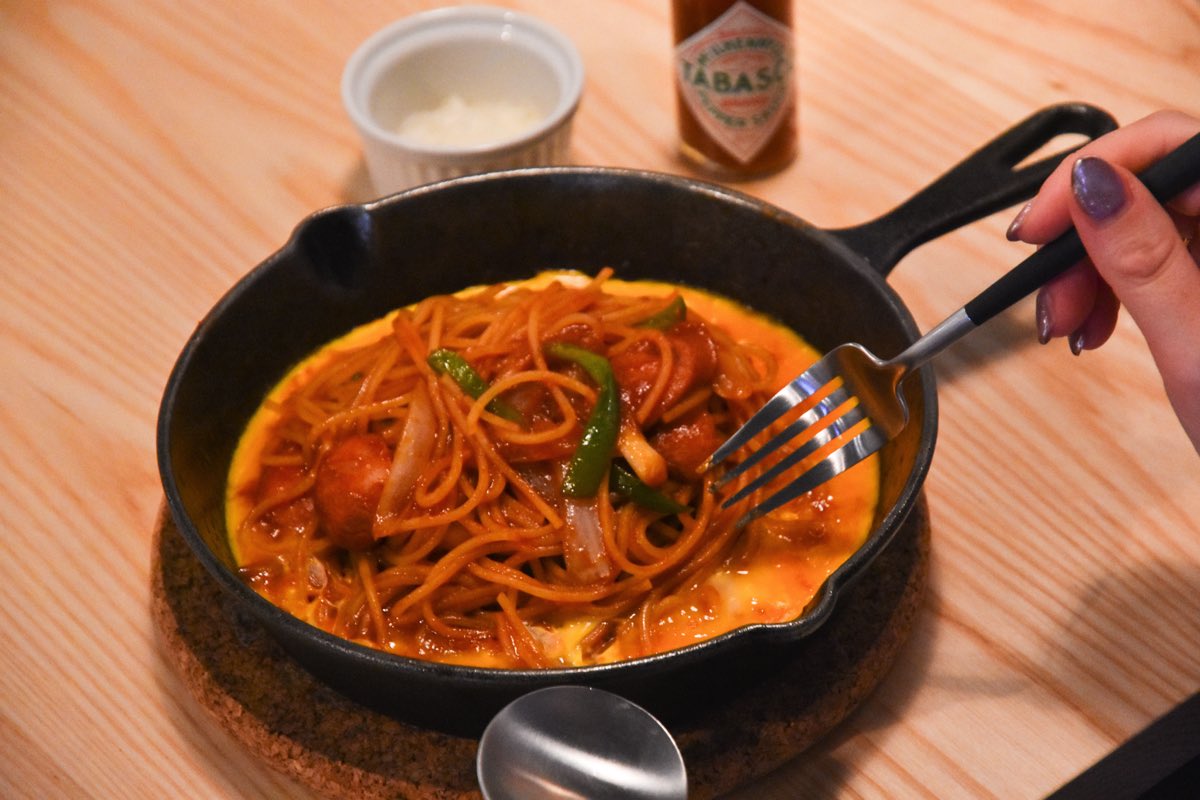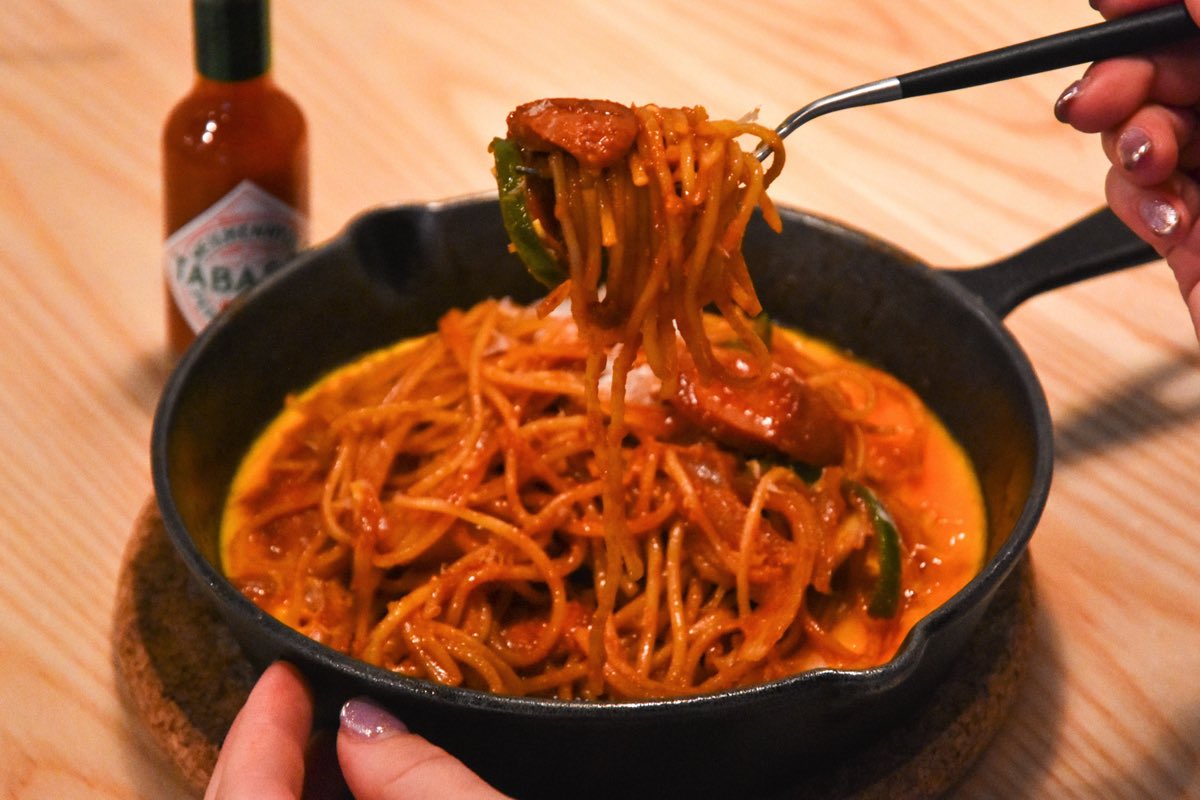 パルミジャーノチーズがナポリタンによく絡み、ここだけのオリジナルの味わいが際立つ。甘めの味付けに濃厚なチーズ、卵と、すべてのバランスが絶妙すぎる‼︎ピリ辛のボルトギューソーセージもマイルドになり、病みつきに。