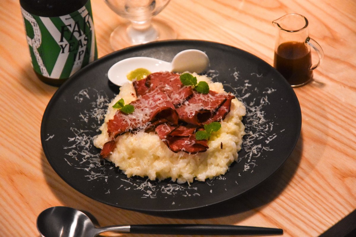 ネーミングに魅了される「夜のローストビーフリゾット」は、厳選したソースをたっぷりかけ、わさびをのせて食べれば和と洋のコラボレーションがたまらない!
