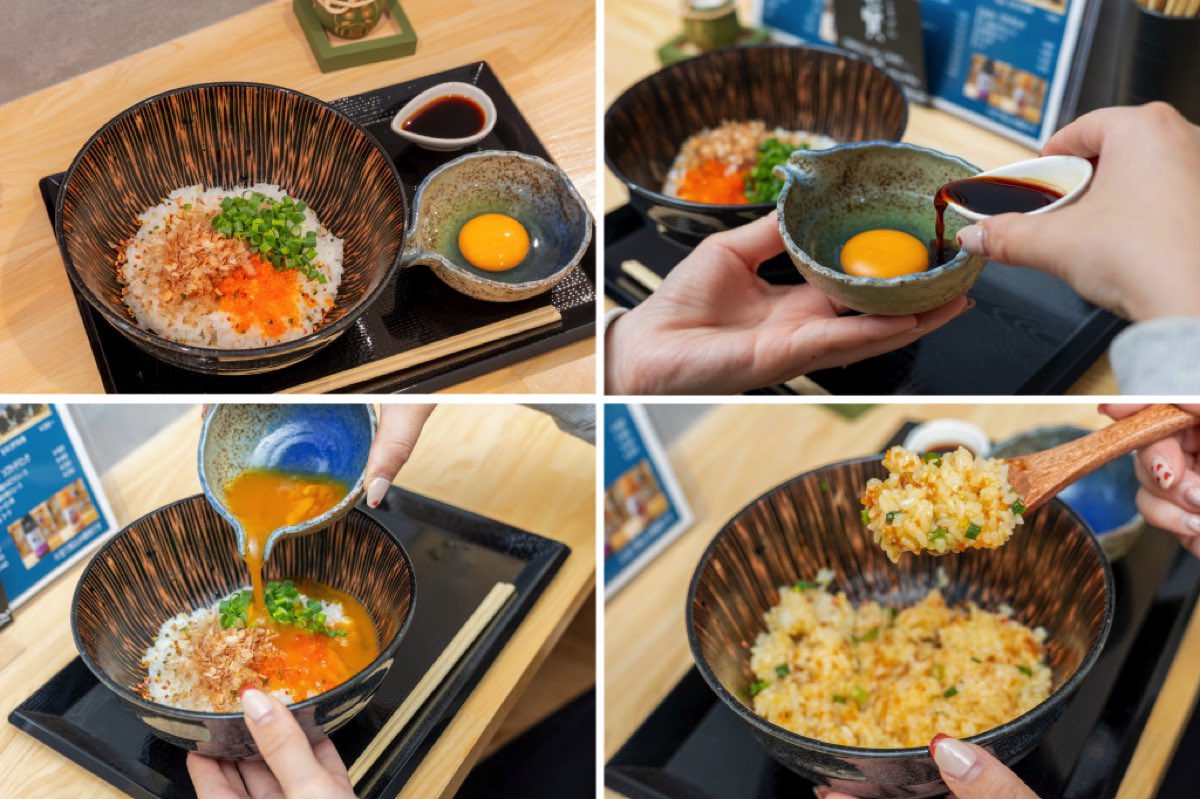 まずは、オリジナル調合した秘伝の「かえし」を少し卵へ。卵を溶いたら鰹節やとびっこ、かぼちゃやにんじんパウダーなどで着色したカラフルな「にしきごま」をのせたご飯にかけるだけ。甘めのかえしと鰹節、にしきごまの香り高く、ひと工夫された味わいが絶品すぎる~。とびっこの食感もアクセントに。