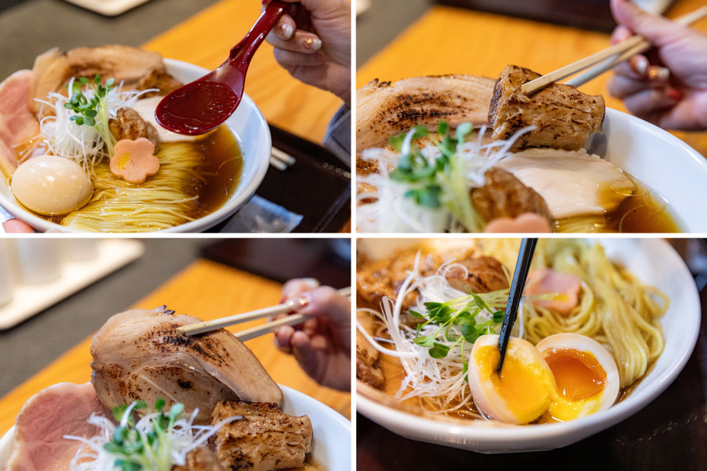 低温調理でしっとり柔らかになった鶏ムネ・モモに加え、さらに炙って香ばしさをプラスした豚の肩ロース、モモ、バラ角煮の5種類の肉肉しい旨み…。醤油のかえしに漬け込んだ黒富士農場の味玉の半熟加減は、神レベル。