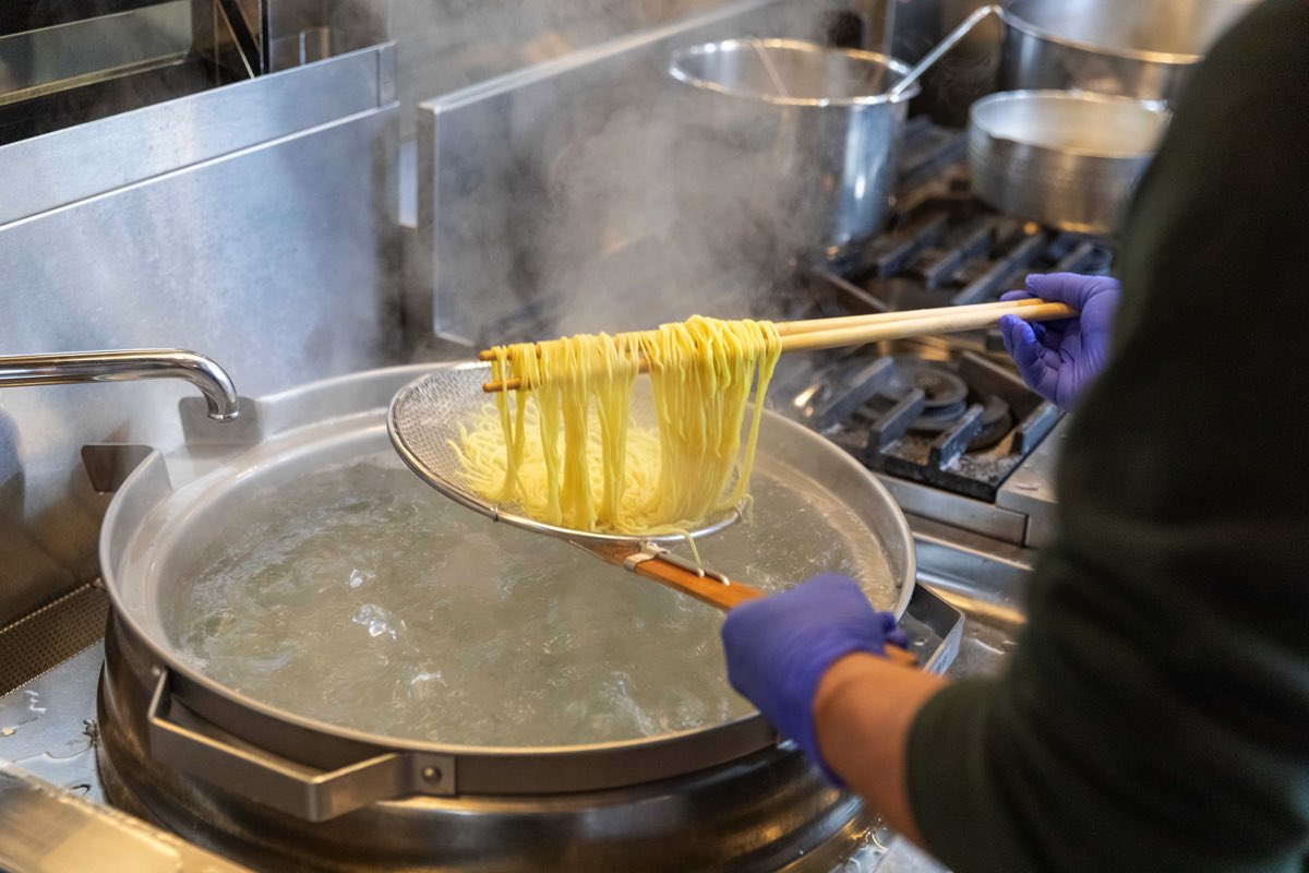 オープンキッチンで、湯気が立ち込め、臨場感溢れる中、出来上がりまでをワクワクしながら待つ。タイマーは使わず、箸の先の感覚だけでゆで上がり時間をはかる、熟練の技にウットリ。