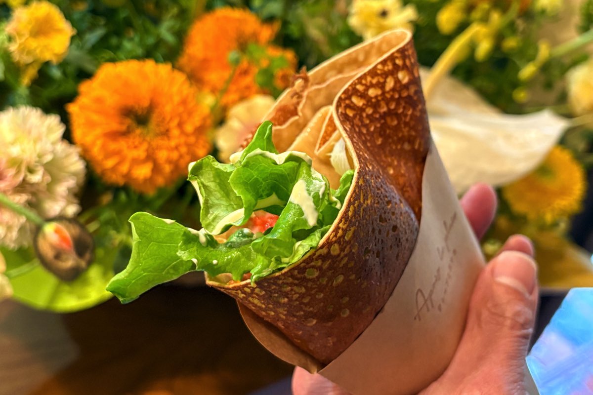 トマト塩麴を使用したトマトやハムチーズなどをくるりと巻いたサラダ感覚のクレープは、ランチにも◎!雨上がりのご褒美に、幸せのクレープを♡