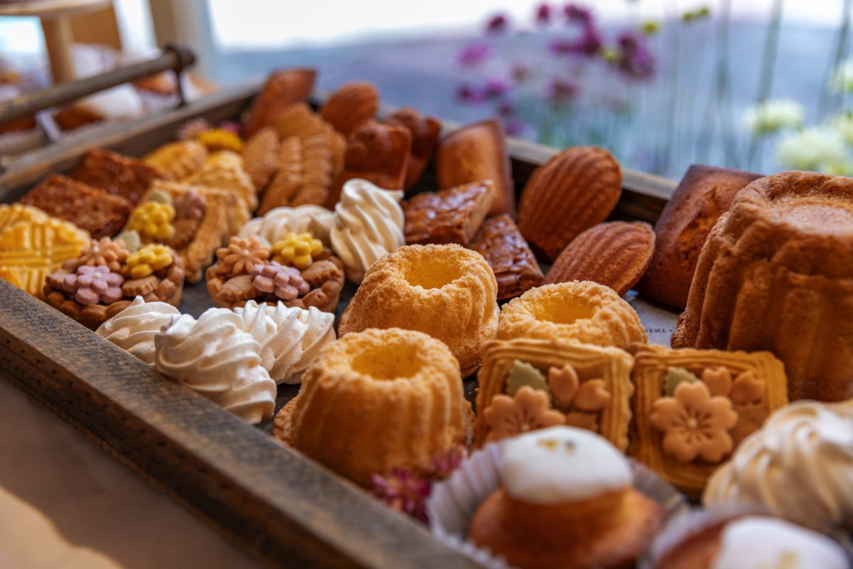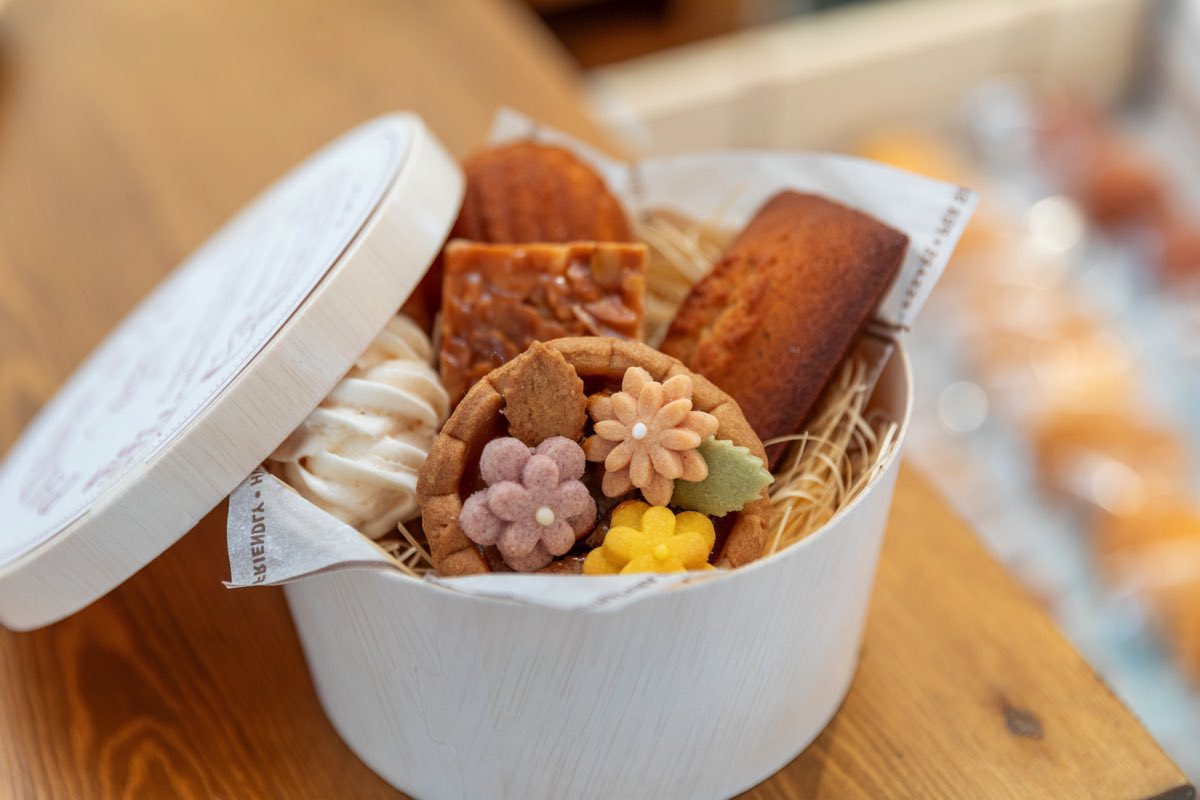 北海道産のバターと兵庫産などの国産小麦粉、新鮮な卵で毎朝焼き上げるお菓子がズラリ。可愛くて美味しそうな、自然素材にこだわった、お花のお菓子とフランス伝統菓子が所狭しと並ぶ。