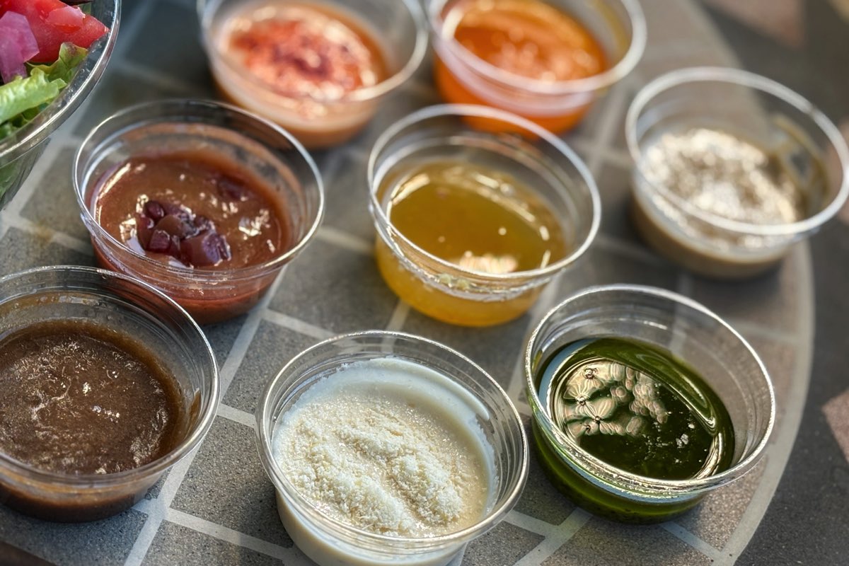 しかも、サラダ1個につき、好きなドレッシングを2種類選べるという。すりおろしニンジン、ピリ辛マヨ、梅しそ、バジル、シーザー、ごま、柚子、アンチョビ醤油の8種類が色鮮やかに並んで、どれも美味しそう!