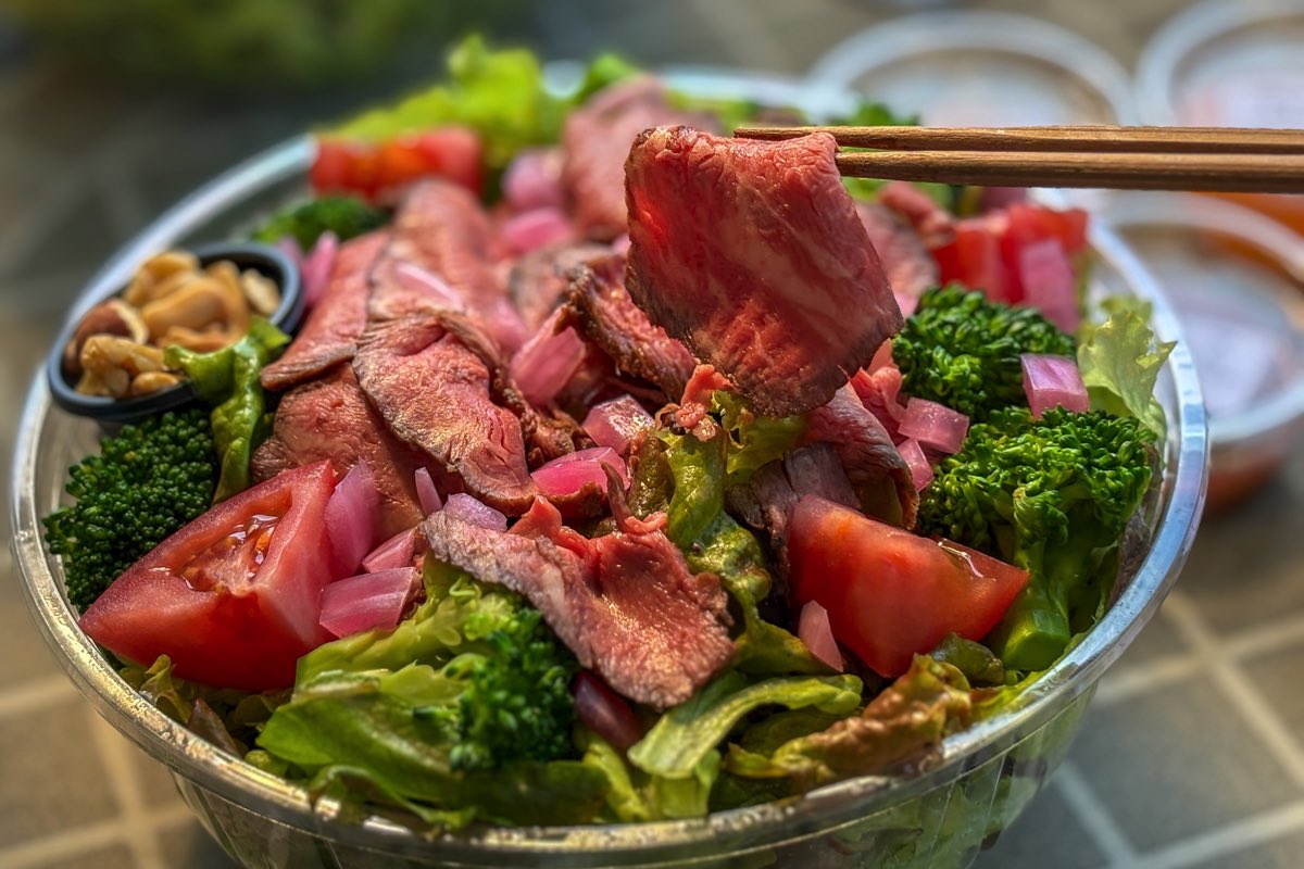 本格イタリアンシェフの技が光るローストビーフと甘酸っぱいソースのマリアージュは、まるでコース料理のアンティパストのようだ。ブロッコリーや枝豆、紫玉ねぎなど、野菜がもりもり摂れて、ナッツの香ばしさもまた良いアクセント。