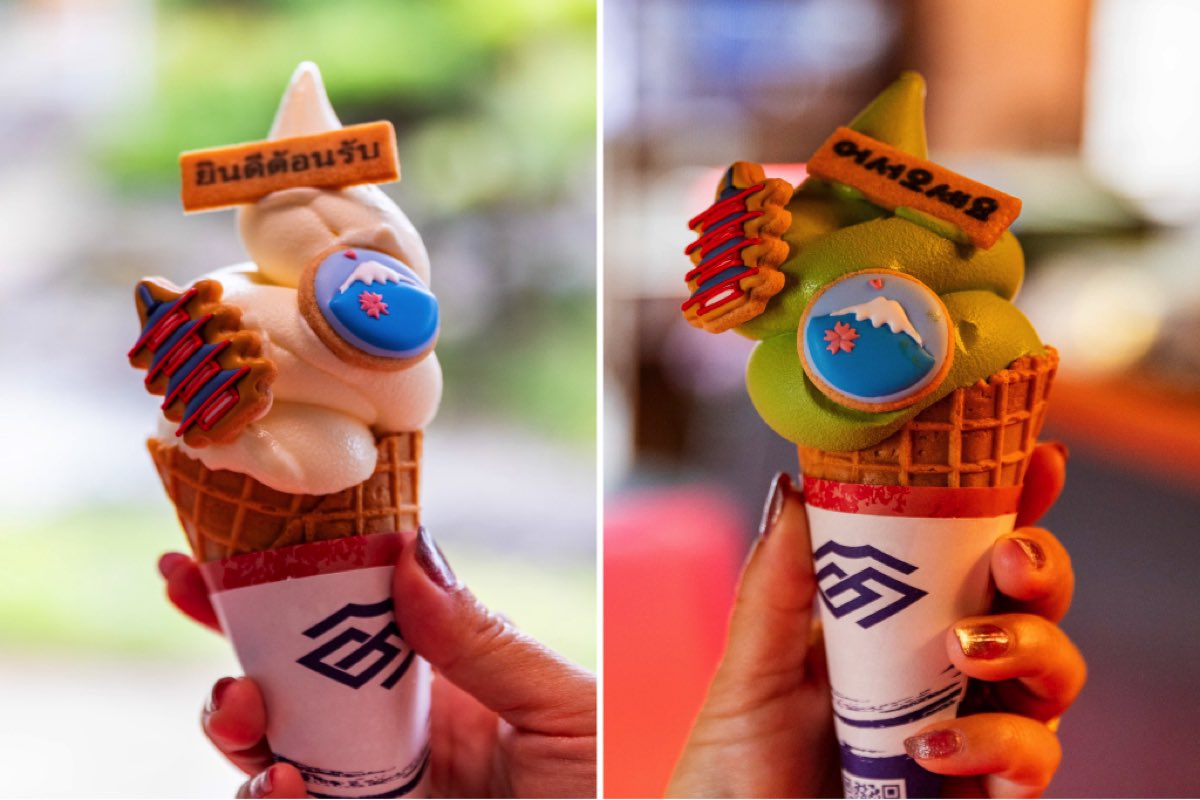 富士山や忠霊塔のアイシングクッキーに加え、タイ語や韓国語などの好きな言語のプレートクッキーを添えて。