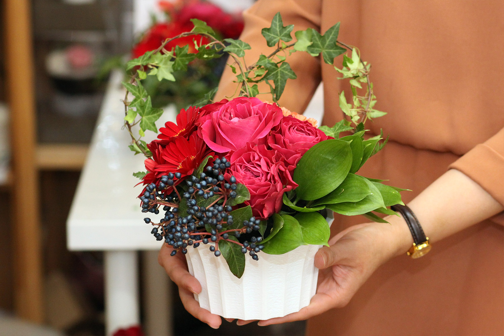 まずは完成図をイメージ。花を選んで長さを整え、高低差や向きを考えながらオアシス全体を使って挿していく。葉は針金で束ねたり、思う形にアレンジ。集中して作っていると時間もあっという間!