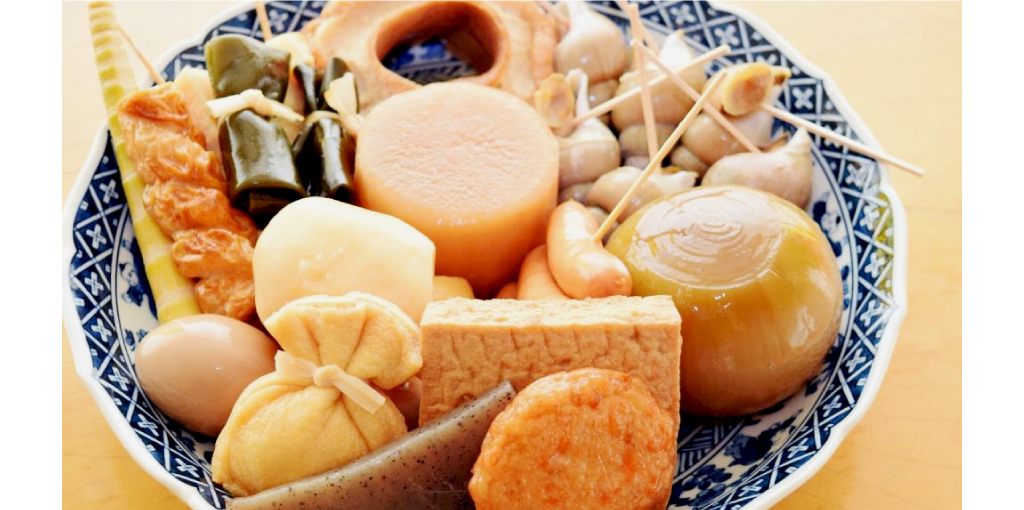 看板メニューのおでん。貝や丸ごと玉ねぎなど珍しいものもあり、見て楽しい食べて美味しい絶品おでんは絶対注文しておこう!
