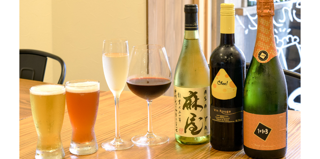 常時4種類ある個性派クラフトビールや約30種類のボトルワインなど、ビール派もワイン派も嬉しい品揃え!山梨のワインも豊富。