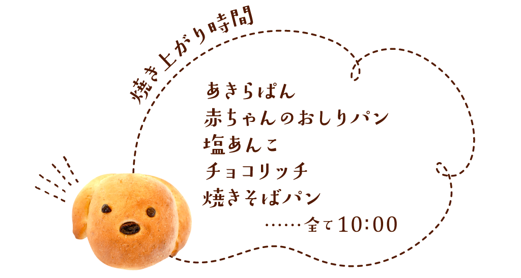 看板犬、あきらくんをモチーフにした人気パン。手作りのチョコクリーム入りで、子どもが大喜び。全粒粉が3割入り、ふわふわ。