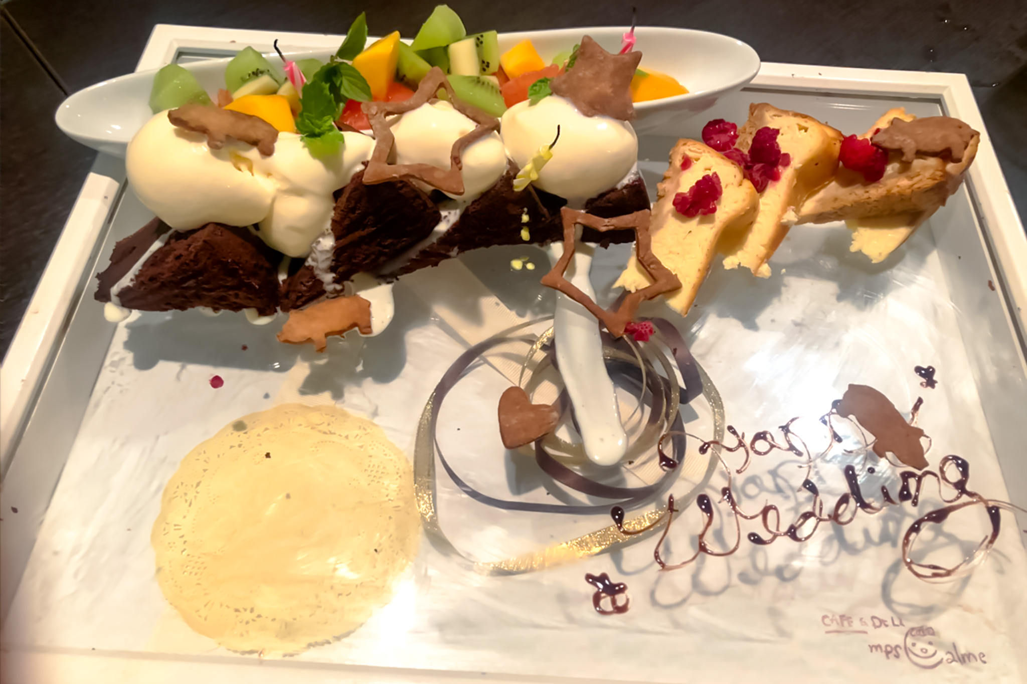 入籍した友人へのサプライスデザート♡予約の時に人数と内容を伝えておくと対応してくれます!なんてかわいいの~!A3サイズくらいの大きなボードの上にガトーショコラやチーズケーキ、フルーツやアイスクリームなどの豪華なデザート盛合せ!主役の友人はもちろん、お祝いする側の私たちもびっくりで大満足のサプライズになりました♪