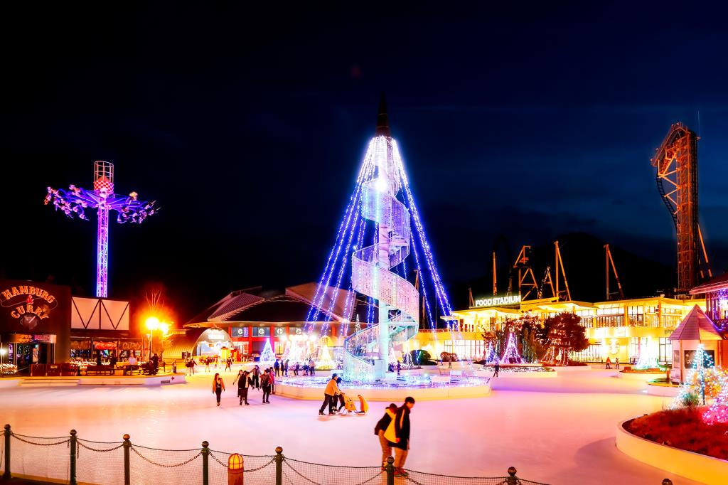 富士のすそ野までを望む絶景スケートリンクとして人気だが、夕方以降はイルミネーションも美しく、また昼間とは違った幻想的な雰囲気の中楽しめるのもいい。