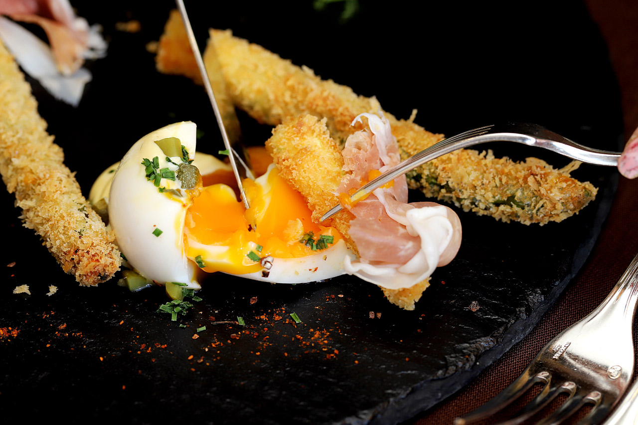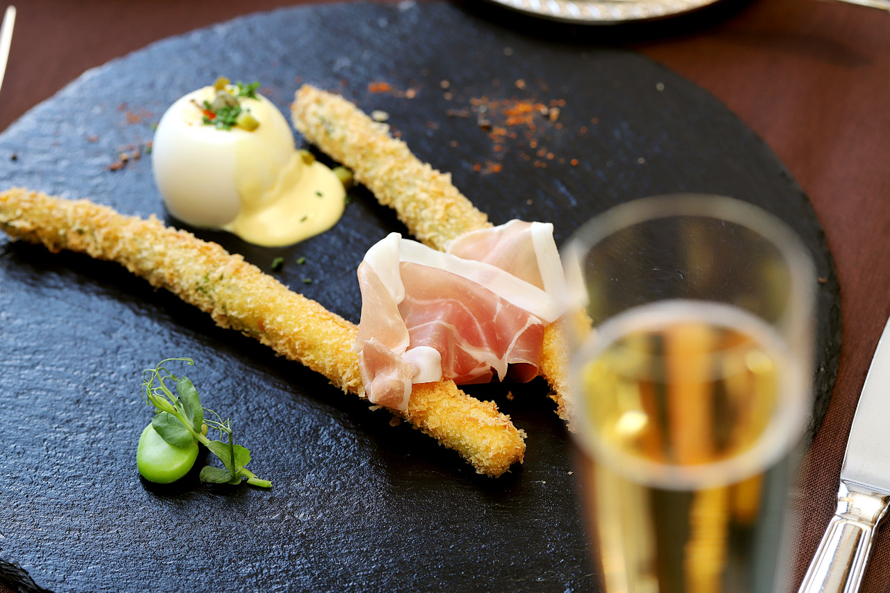 1本丸ごとを揚げたアスパラガスのパン粉揚げは、カリッとさくさく衣をまとわせた、豪快な逸品。生ハムを添えて、ワインとの相性も格段にアップ。シンプルな味わいながら、きめ細やかな手仕事と綿密に計算された揚げ具合が、ホテルならではの美しい前菜に昇華する。1品ずつなされる丁寧な説明もまた、料理への期待感を高めてくれる。