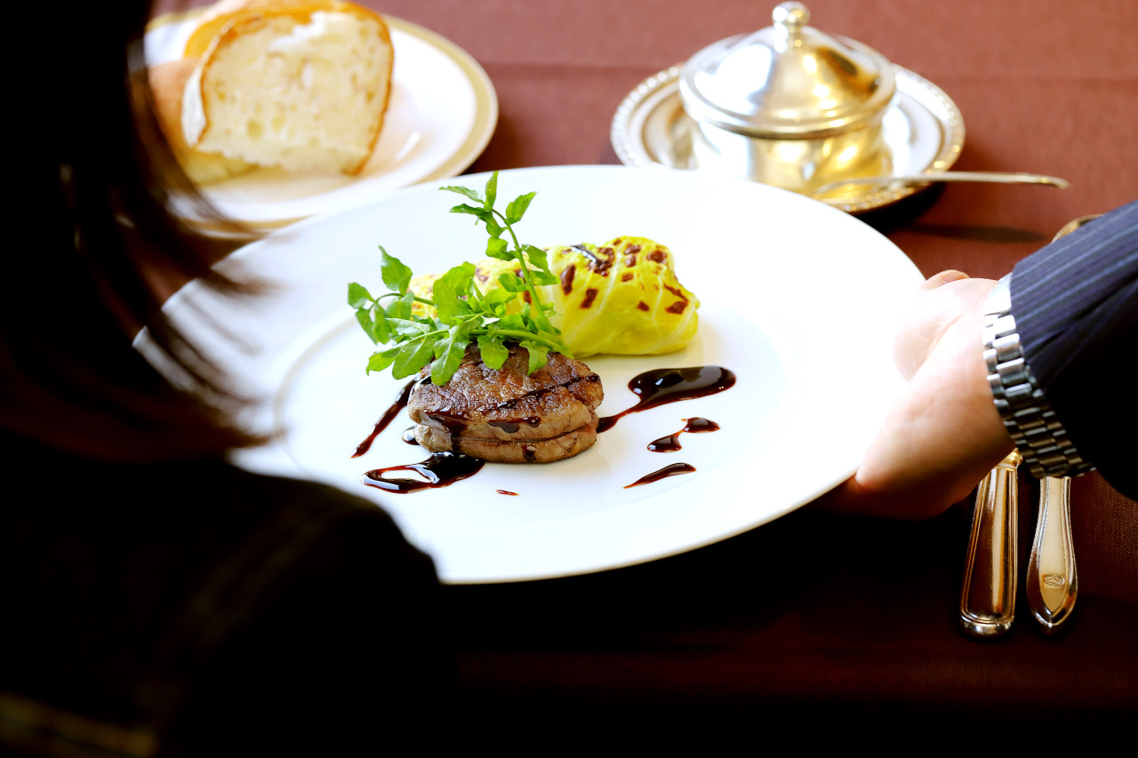 メインは国産牛フィレ肉のポワレ 春キャベツロールとともに。さすが老舗ホテルの品格を思わせるべく盛り付けも美しく、洗練された上質なサービスとあわせて、優雅なひと時を満喫しよう。