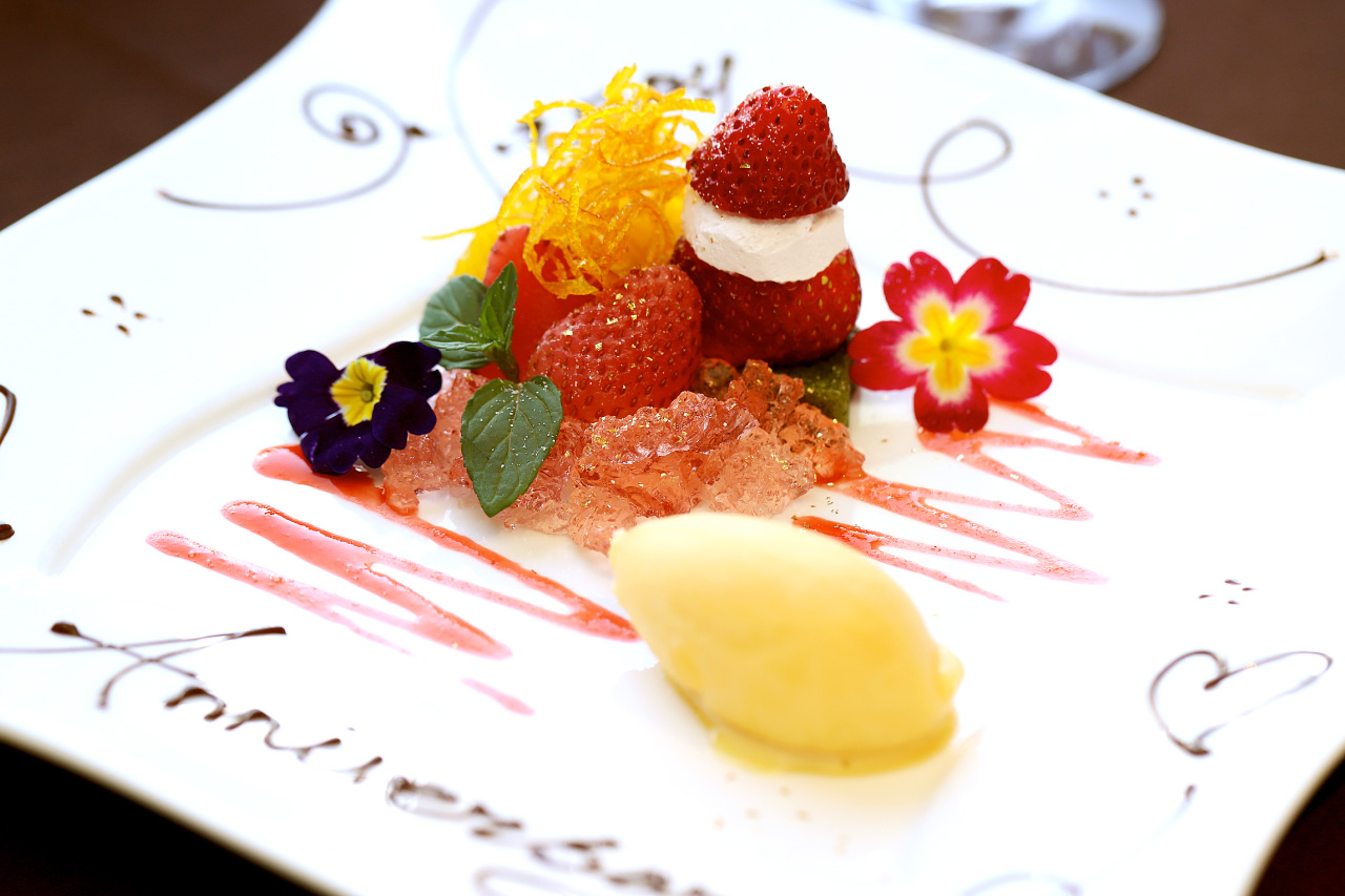 コースの最後は、苺とオレンジのコンポートと抹茶のブラウニーの麗しのデザート。オレンジのフレーバーが香るシャーベットが添えられ、フルーティでさっぱりといただける。予約時に記念日であることを伝えればメッセージプレートにもしてくれるので、一言声をかけておこう。