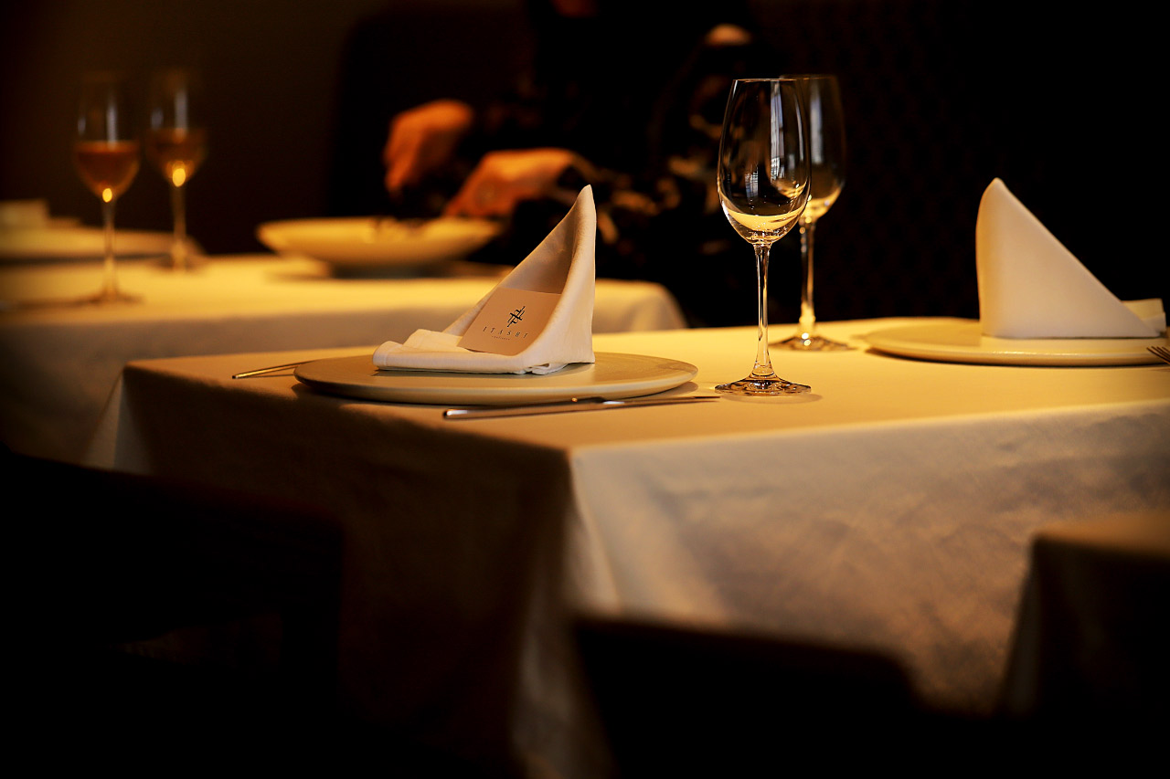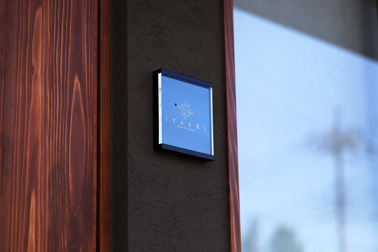 特別わかりづらい場所というわけでもないのに、隠れ家のような密やかな雰囲気が漂う。ガラスのファサードをやわらかな光が透過し、小さな木の扉はささやかな非日常への入口。夕暮れが暗闇に包まれたら、“ITASHI”という美食の劇場が幕を開ける。遊び心とトラディショナルが見事に競演する、麗しのフレンチへようこそ。