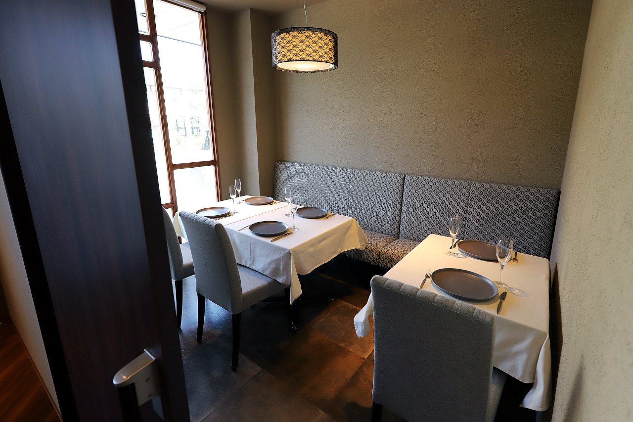 白とグレーを基調にした清潔感溢れる空間は、スタイリッシュながらも程よいカジュアル感を兼ね備える。ガラス越しには広々とした個室もあり、個の空間と開放感が心地よく混在する。