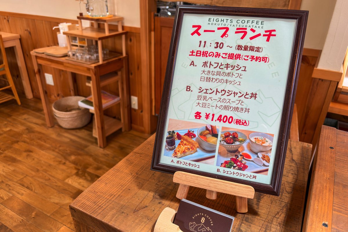 八ヶ岳の大自然の中で、カジュアルに自家焙煎珈琲が堪能できると大人気の「EIGHTS COFFEE」で、2025年2月から土日祝日限定のスープランチがスタート!さっそく行ってきた♪