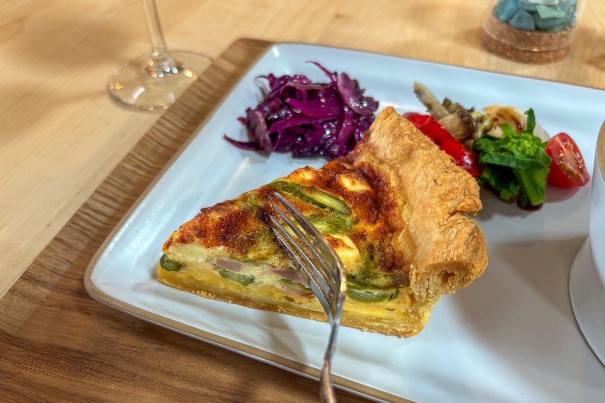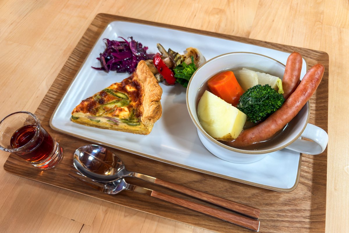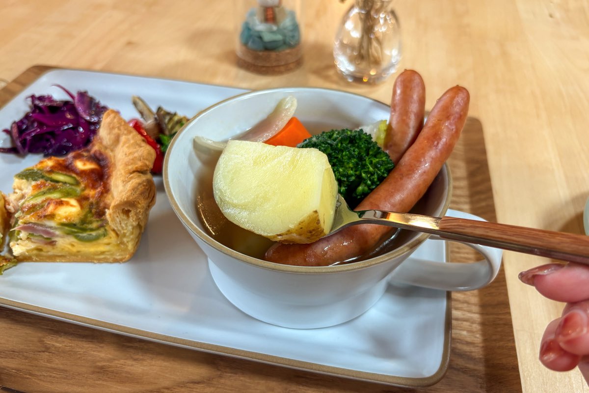 今回はAセットの「キッシュとポトフ」をチョイス!具材が日替わりというキッシュは、生地から丁寧に手作りし、毎朝焼きたてがいただける。取材日の具材は「アスパラとベーコン」と、間違いなしの鉄板の組み合わせ♡