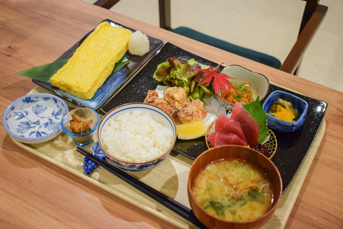 まぐろのお刺身に唐揚げ、特選卵のだし巻き玉子、と、誰もが大好きな一品を全部まとめてセットで味わえちゃう、欲張り定食。生姜やニンニクでしっかりした味をつけたジューシーなから揚げや、鮮度抜群のお刺身はもちろん、何といっても超ビッグサイズのだし巻き玉子の存在感がすごい。和の職人が手間暇かけて出汁にこだわったというだけあって、なかなか定食では味わえない逸品だ。