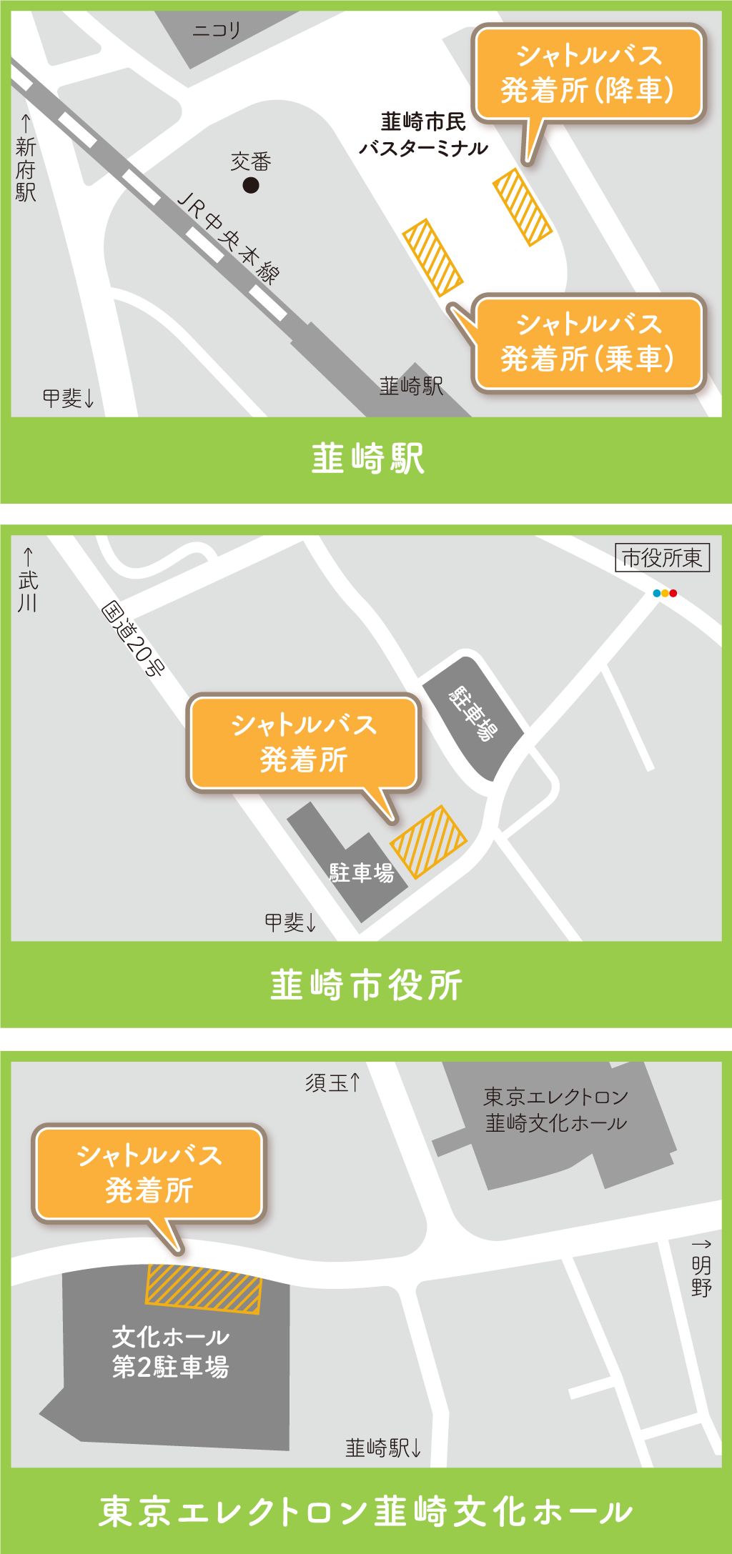 - ・韮崎中央公園付近の駐車場には限りがありますので、車での乗り合わせやシャトルバス等をご利用いただきご来場ください。