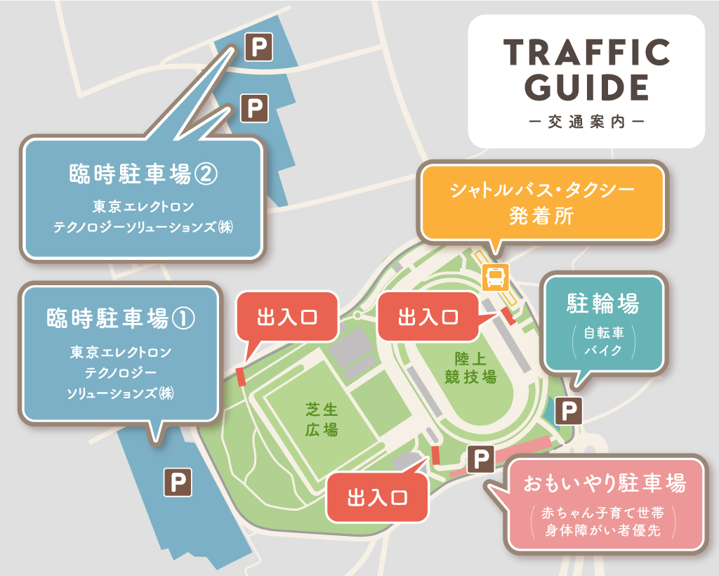 - ・陸上競技場や芝生広場の競技エリアへは、ヒール等の芝を痛める靴やベビーカーでの入場は出来ません。スニーカーや運動靴などの平靴でご来場ください。