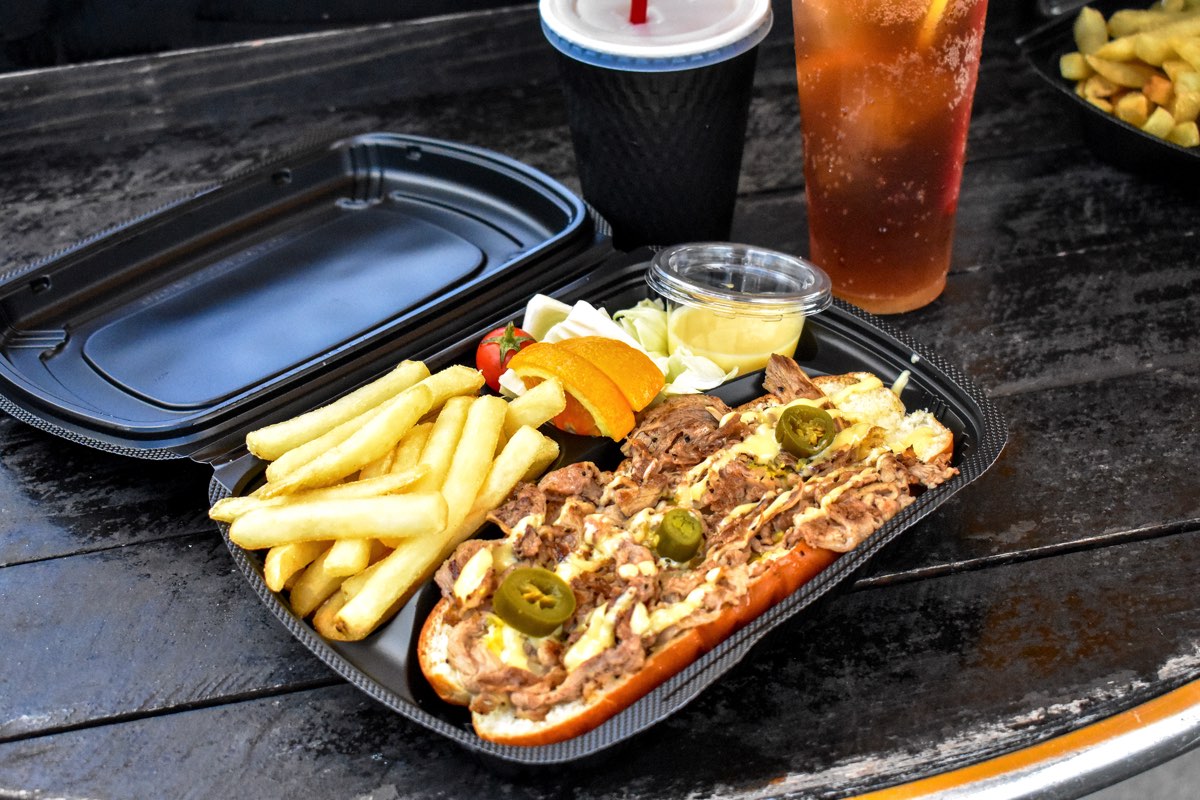 一番人気はハラペーニョがピリリと効いたチーズステーキサンドセット。ふかふかパンにステーキを豪快にサンドして、アメリカンテイストに溢れる。じっくり炒めた玉ねぎも甘~く、いいお仕事♪
