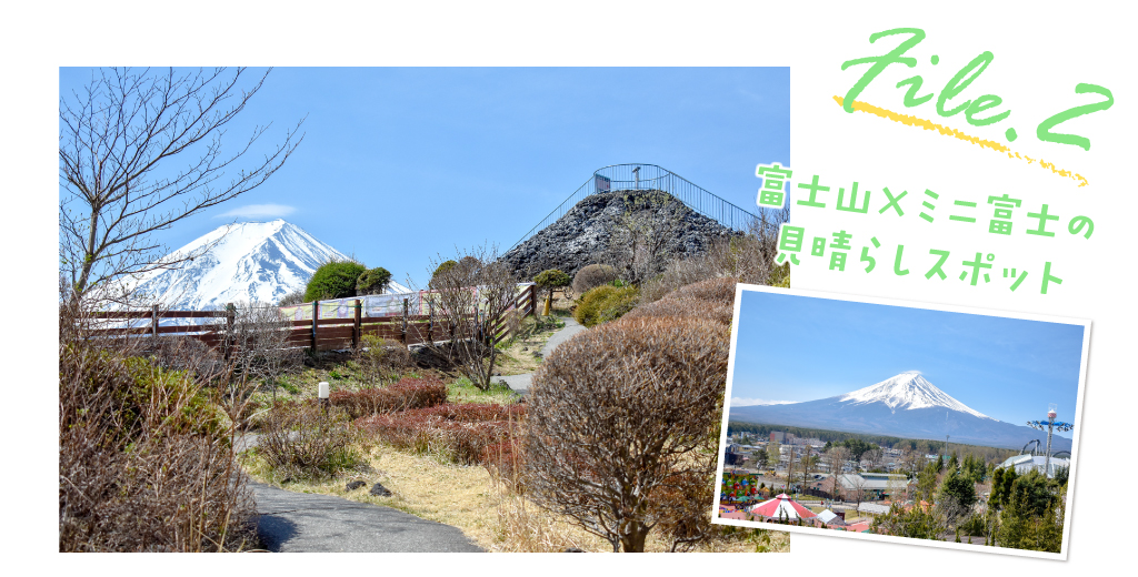 絶望要塞近くの、園内のほぼ中央部にあるミニ富士。富士山とミニ富士のコラボを下から望むのもなかなか。急な坂道がやや大変だけど、ミニ富士に登ればさらなる絶景が広がる。下から見上げる富士山とはまた違った表情に出会えるので、登った甲斐あり!