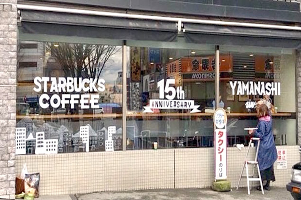 某コーヒーチェーンの15周年アニバーサリーのガラスペイントでは、3面ガラスに描くという“はじめて”を体験。特定の誰かではなく、道行く不特定多数の人に見てもらえる喜びを味わいました。