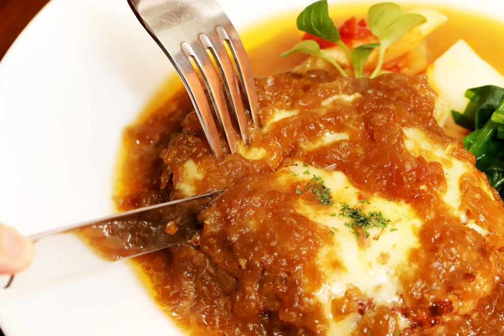テーブルに運ばれるやいなや、醤油とガーリックの香りがたちこめる『新・和風味チーズハンバーグ』。この香りだけでゴハンが進みそう!ふっくらとしたハンバーグにソースとチーズをたっぷり絡めて頬張れば、濃厚な味わいが一気に広がり、思わず恍惚の表情に。
