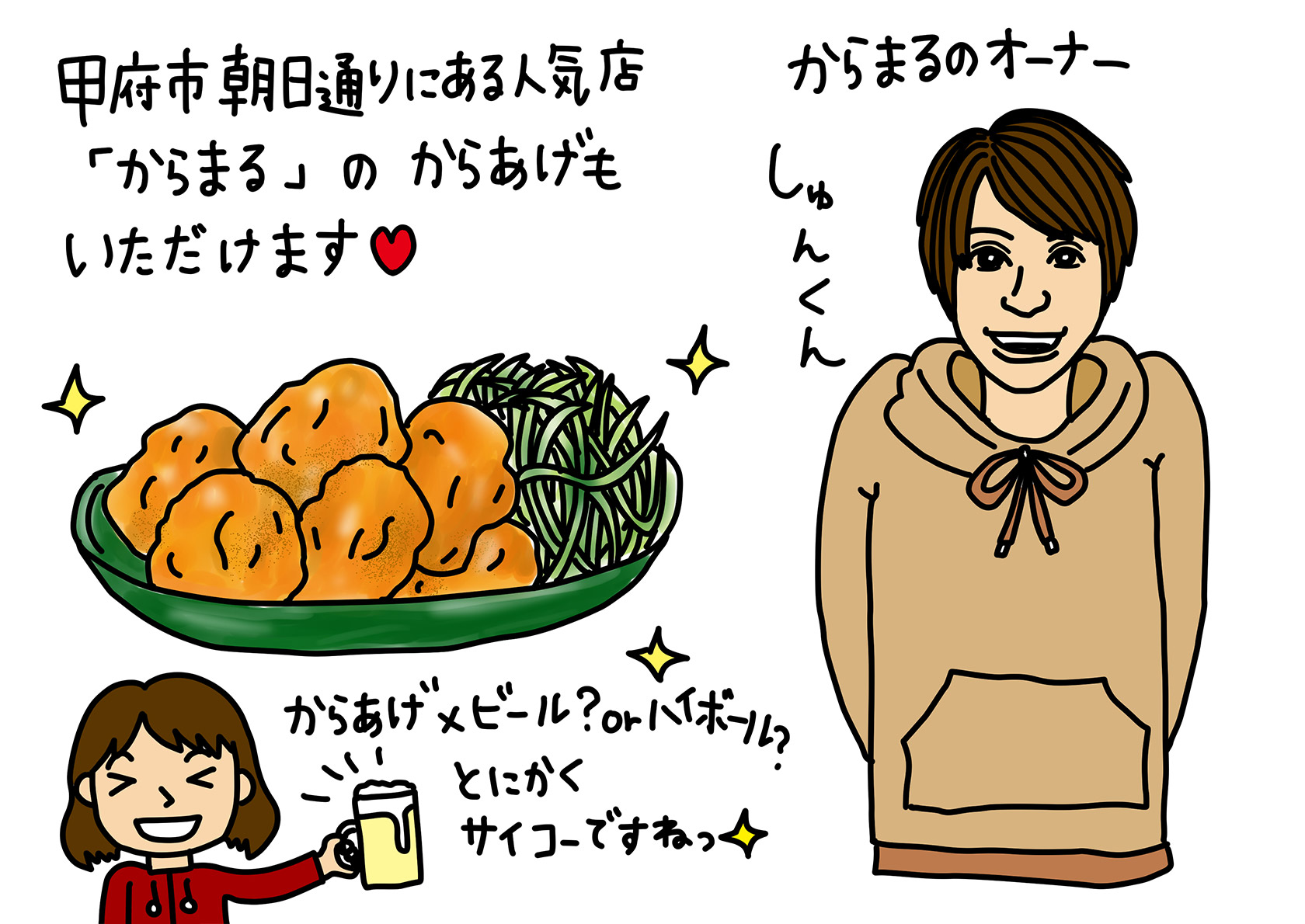 朝日通りにある人気の唐揚げ屋さん、からまるのオーナーしゅんくんがいる時も~!