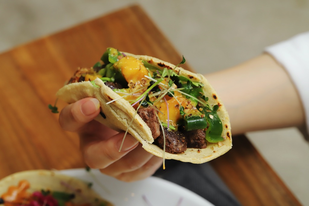 こちら期間限定!甘い桃とお肉!?牛と桃のタコス、