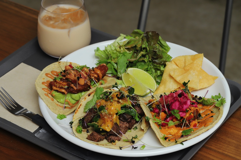 おすすめは3種類のタコスが楽しめるプレートで、定番タコスと期間限定タコスから選べるものに。