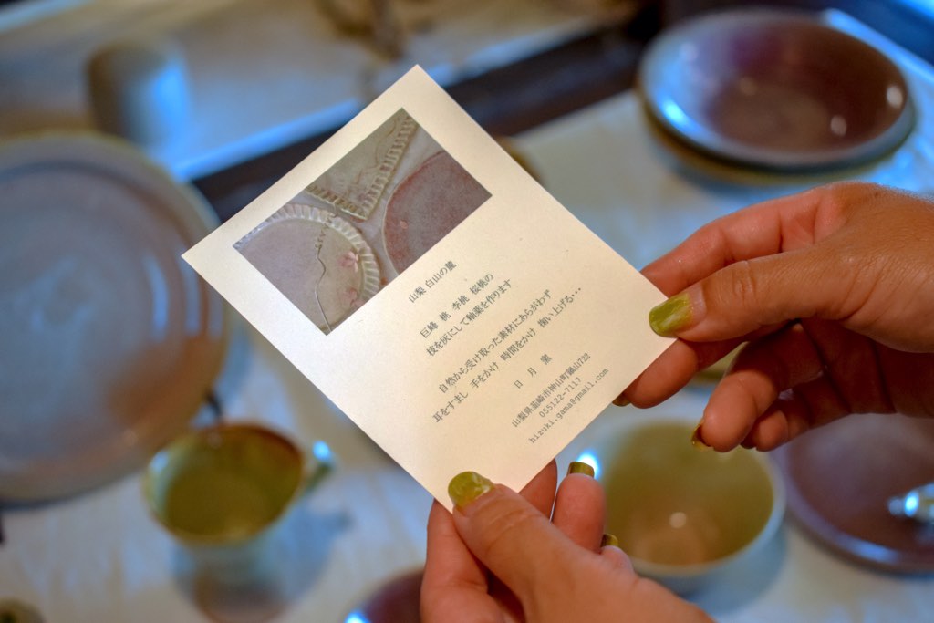 日月窯二代目、亮さんのつくる器は、すももや桃、ぶどうなどの山梨の果物の枝を釉薬にして色付けした独自の技法で、一つひとつ違った表情で穏やかに語りかける。