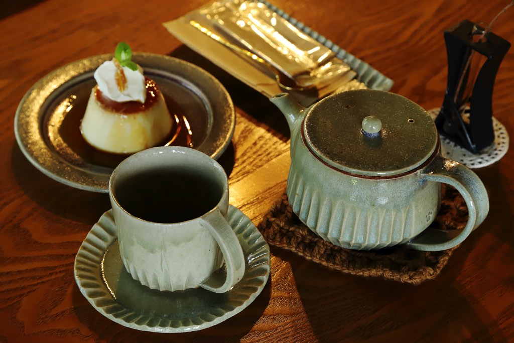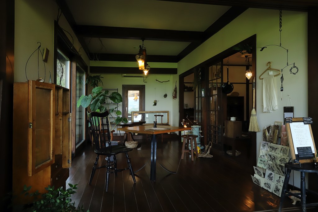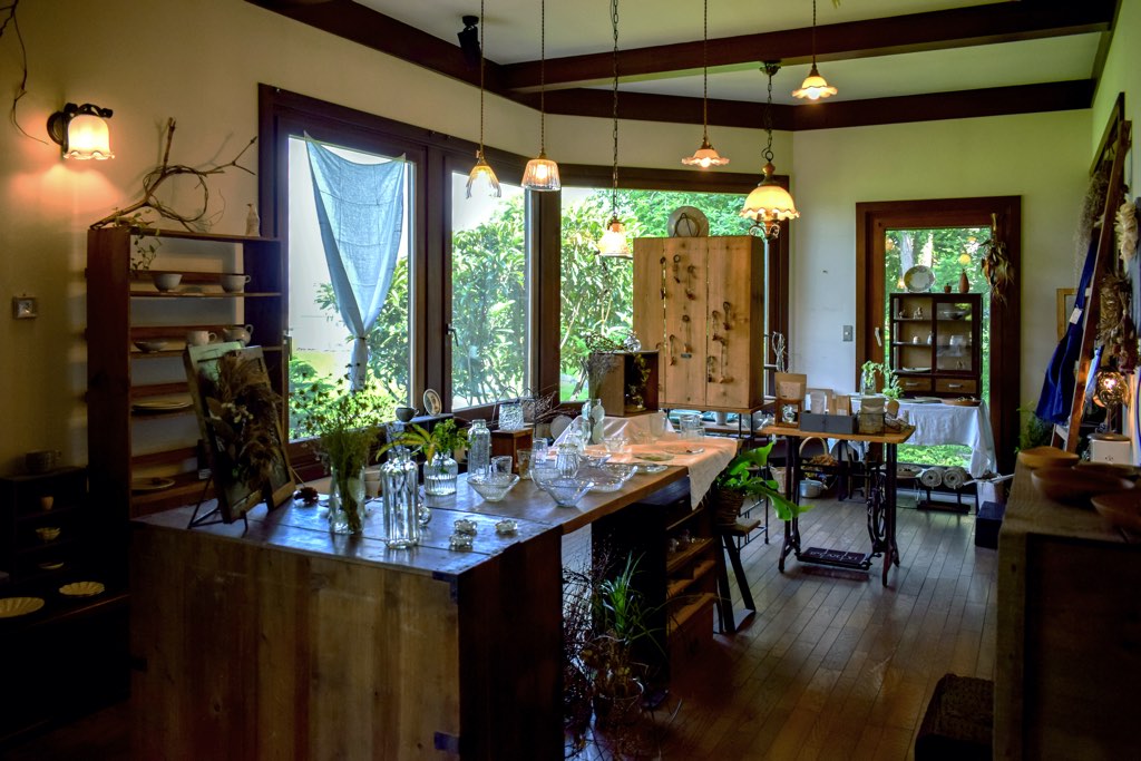 アンティークな家具に囲まれた店内には、隣の工房「日月窯」で作った器をはじめ、オーナーの三井さん自らがお店に置きたいとセレクトした全国の作家さんの器や雑貨が揃う。