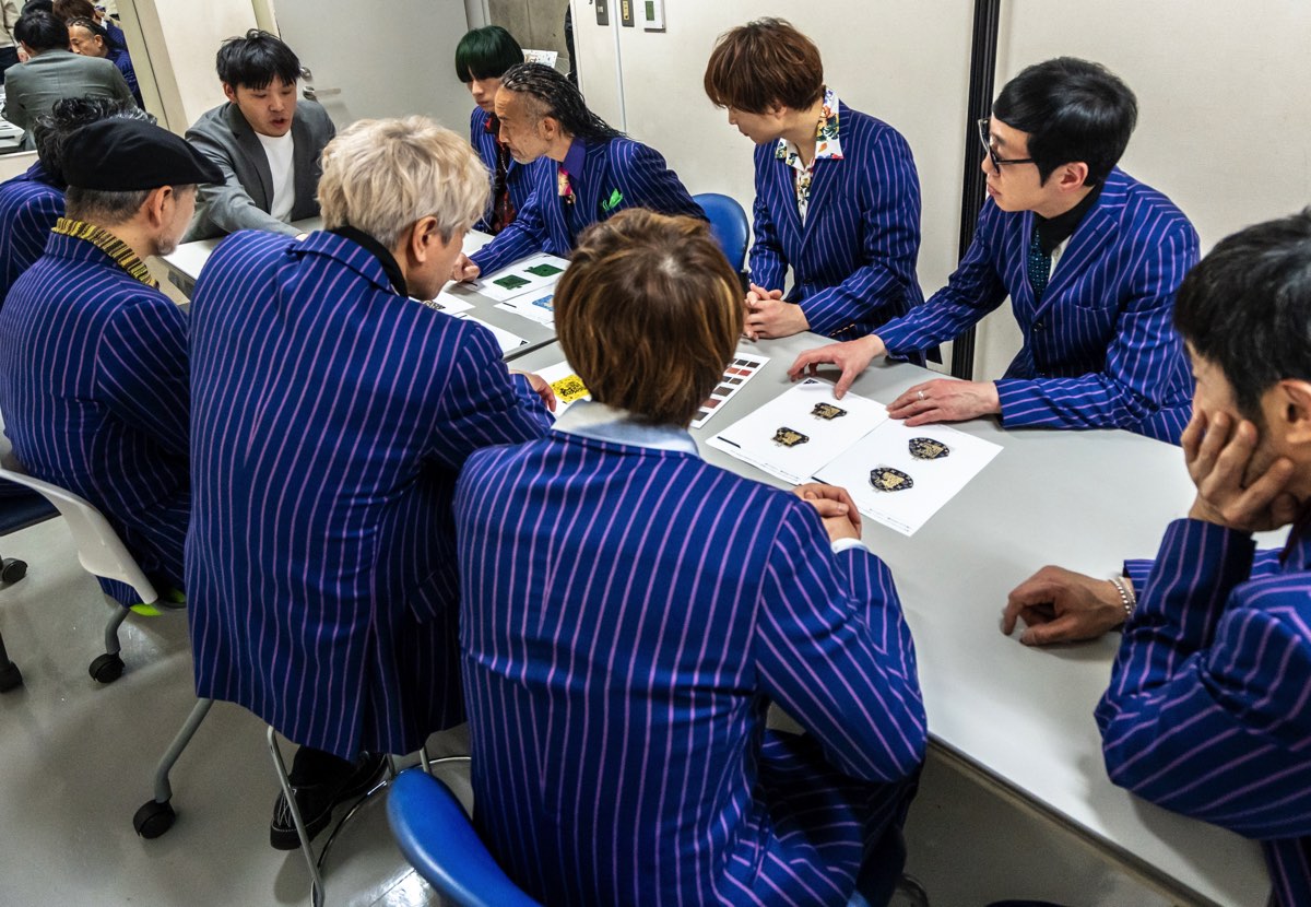 「35周年の文字もいれよう」「色のバリエーション欲しいよね」「この色はスカパラっぽいんじゃない?」「この形がいいなあ」「これ、俺も欲しい!!」などと、盛り上がる面々。9人もいれば全員の意見をまとめるのは大変…!?と思いきや、そこはさすがの団結力!アッという間にデザインが決まっていき、あとは染色・裁断・柄付け・縫製仕上げ…と工程を重ねていくのみだ。